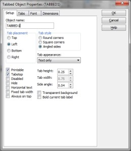 As you can see, there are several things you can do; set tab placement, color, tab shape, bold text and even make the tabbed object transparent. What you cannot do is set the object style to gradient and you are limited in using object code.