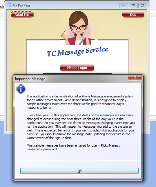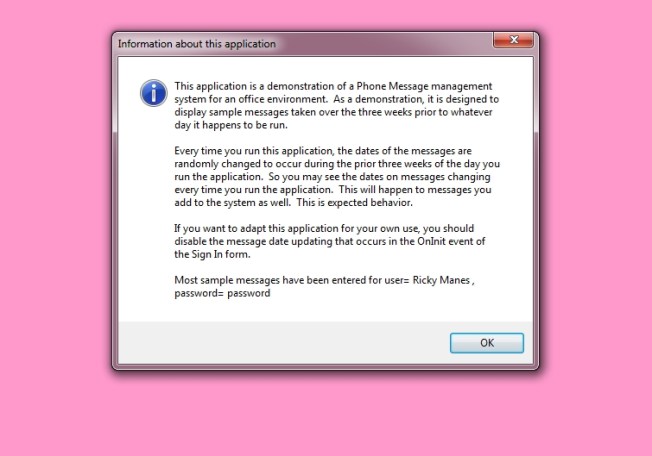 x = "This application is a demonstration of a Phone Message management system for an office environment. As a demonstration, it is designed to display sample messages taken over the three weeks prior to whatever day it happens to be run." +crlf(2)+"Every time you run this application, the dates of the messages are randomly changed to occur during the prior three weeks of the day you run the application. So you may see the dates on messages changing every time you run the application. This will happen to messages you add to the system as well. This is expected behavior. If you want to adapt this application for your own use, you should disable the message date updating that occurs in the OnInit event of the Sign In form. " +crlf(2)+"Most sample messages have been entered for user= Ricky Manes , password= password "