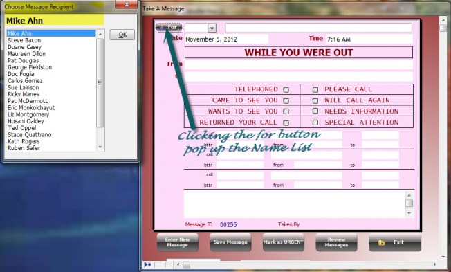 As I explained in the video, the for button on the form was used to pop up a list array of names of anyone in the system who could receive messages.