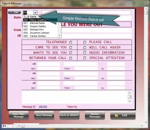 This method is simple and only requires the receiver name be set to the for variable as part of the On Change event of the ID field. Later we will be adding the ability to navigate through the records of the Take Message form and the same procedure can be used to place the receiver name in the for variable by adding the following code to the ON Fetch event of the form.