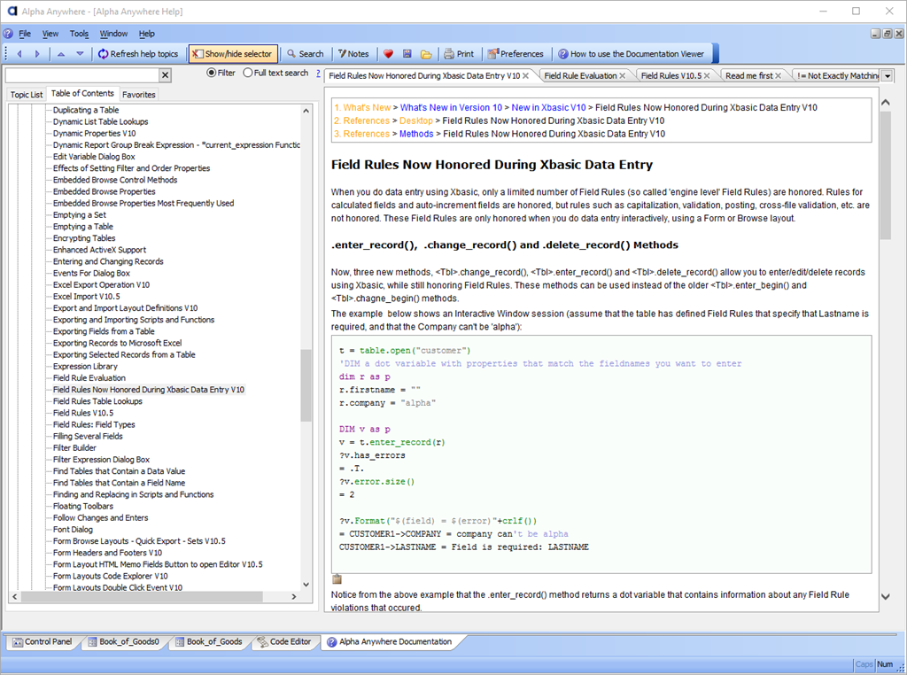 Lets talk about data field formatting. If you have been following my blog for any length of time, you know I like to set my field property values on the form using xBasic. In this application I am using field rules instead. The reason is many of these fields will show up on various forms and I want them to look and perform the same regardless of the form or report they are on. In field rules you set the property once and it works that way each place it is displayed. It would be tedious to go through all the field rules so if you need help, just click help at the top of your control panel and choose Open Documentation from the drop down menu. The image below shows the excellent help for field rules.