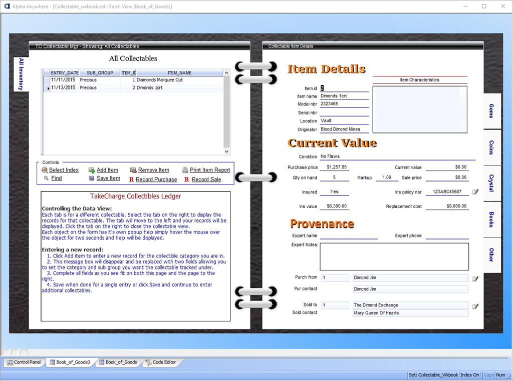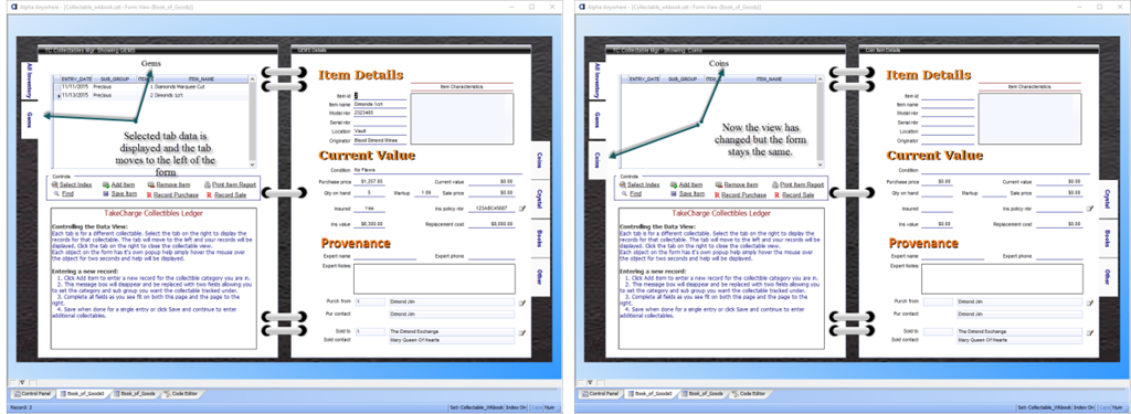 Now our form is not complete yet but you can see where we are going with it. Each tab is a collectable group and when the tab is selected on the right the page turns showing the data for that group. (This is done by setting a filtered index to display only data for the selected group.) The tab then moves to the left side of the form and disappears from the right side giving the illusion of a page turn. If the user clicks the tab on the left, the tab moves back to the right and the data view is changed to the topmost tab on the right. Very cool! The image below shows two different views based on the tab selected. Notice that data displayed is changed, but the form stays the same.