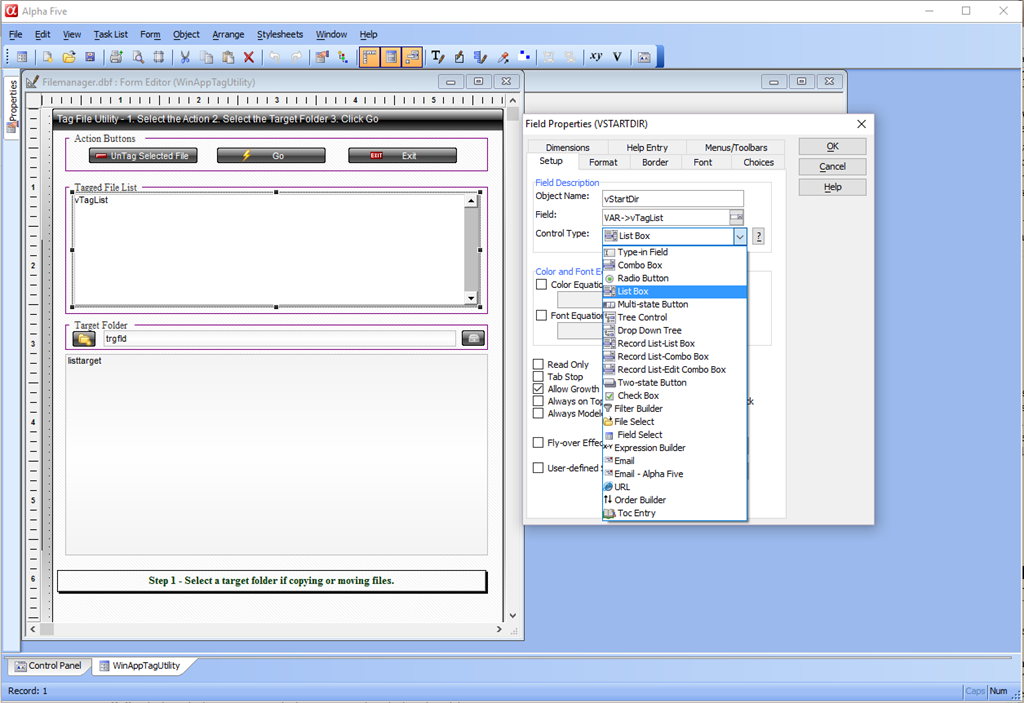 In this example, we have a list of files within the selected folder written to the variable ListSource which is stored in memory and bound to our form by making it the choice for our variable vTagList. So, by definition, our List is now a Lookup. You will create lookups like this when you need the user to make a decision and provide feedback to your program before proceeding. Here the user must verify the list is correct before clicking go which then performs the requested action against all files in the list.The types of list you can create are data list, field list, table list, report list, record list and many more. We will look at many of them as we work through future lessons.