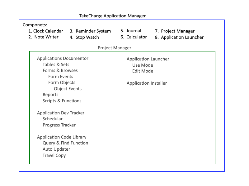 Today we embark on a fairly complex trip into the development and design of the TakeCharge Application Manager which will be developed in Alpha Software. The function of this application is to be an external vessel which will house any and all applications being developed by the user which is currently me. To help us understand the scope let’s use a visual aid.