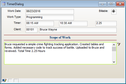 Filled in. When done, the user clicks the hotspot again and the timer stops. The Timer Dialog is displayed. Now the user fills in the notes and checks if the work is billable or not. Lets look under the hood of our form and at the code which runs the timer.