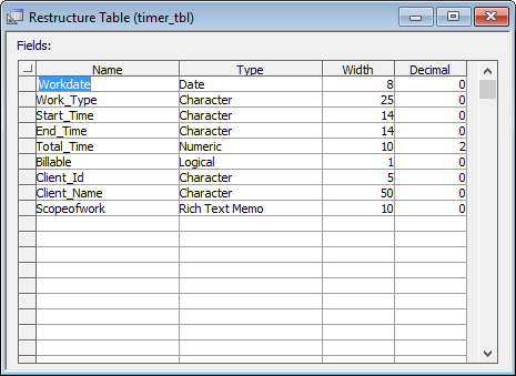Our table consist of a date field to track the work date and a start and stop timer field as well as a work type field and a billable field. This gives us everything we need for tracking the billable hours and by including client id field we can link the work to our client for billing purposes. Lets look at our form.