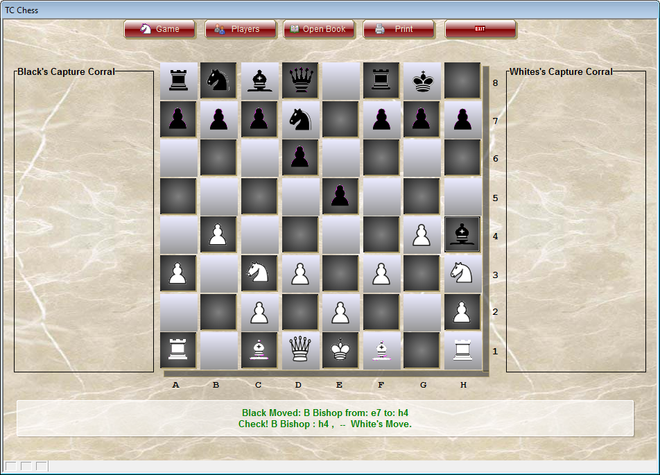 - D7 – Open—W Bishop : B5 &Open—B Knight : B8 -B Bishop : C8 -B Queen : D8 -B King : E8 –