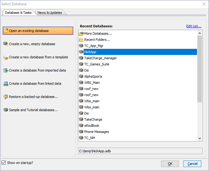 There is no function in xBasic (at least that I can find.) which will let you create and app using xBasic. I did however, come up with a solution. Using file.create I create a file with the name I want for my app and save it with the extension of ‘adb’. I then open the file using sys_shell which allows me to point to A5 v10 and pass the command line of my new app file. Alpha Software does the rest. Below is the Select Database dialog which shows the NickApp I just created,