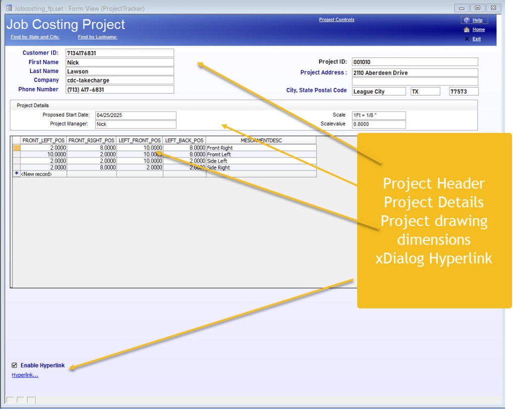 The Contractor will walk-off the area to be worked on and take measurements of any and all other areas in the job. Then he/she simply enter those measurements into the browse window on the form and clicks the Hyperlink to create the drawing and cost out the job instantly.