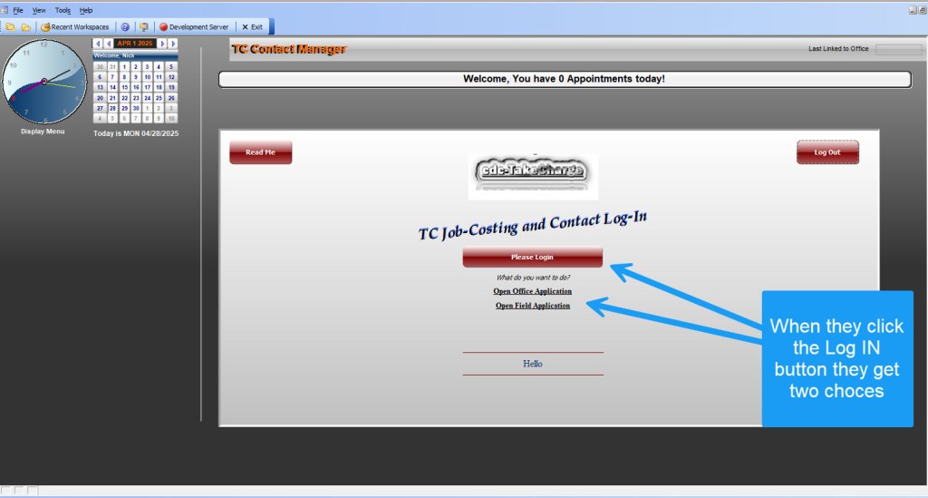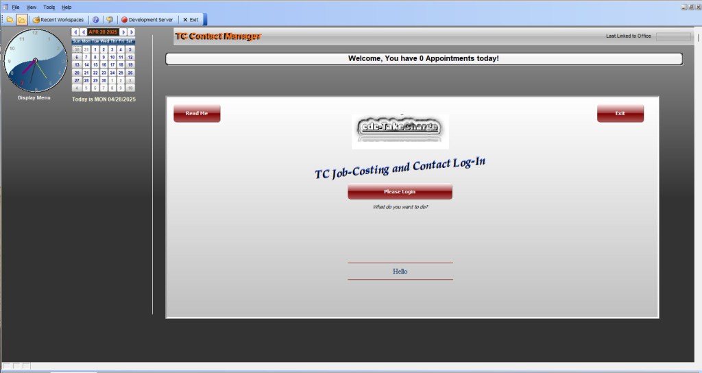 As you can see, the log in screen is simple to use and manage.As for the rest of the video you may have noticed the supercontrol showing the Activities rpt for the business. This will filter to the current month showing all appointments. Additional reports will be added so the user can quickly see the reports which help manage his business. The note organized drills down to the selected day on the calendar and the days which have appointments or reminders show up with red dates on the buttons. The menu button on the clock is a drop down menu which allows for easy navigation to all accessible features and makes for a simple way to keep various security levels set by user log-In authorization level.
